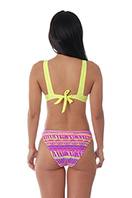 Bikini con top amarillo liso con herraje especial, calzón estampado de colores.